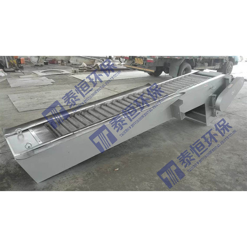 回轉(zhuǎn)式格柵除污機設備是由一種獨特的耙齒廠裝配成一組回轉(zhuǎn)格柵鏈。在電機減速器的驅(qū)動下,耙齒鏈進行逆水流方向回轉(zhuǎn)運動。耙齒鏈運轉(zhuǎn)到設備的上部時,由于槽輪和彎軌的導向,使每組耙齒之間產(chǎn)生相對自清運動,絕大部分固體物質(zhì)靠重力落下。另一部分則依靠清掃器的反向運動把粘在耙齒上的雜物清掃干凈。按水流方向耙齒鏈類同于格柵,在耙齒鏈軸上裝配的耙齒間隙可以根據(jù)使用條件進行選擇。當耙齒把流體中的固態(tài)懸浮物分離后可以保持水流暢通流過。整個工作過程是連續(xù)的,也可以是間歇的。
